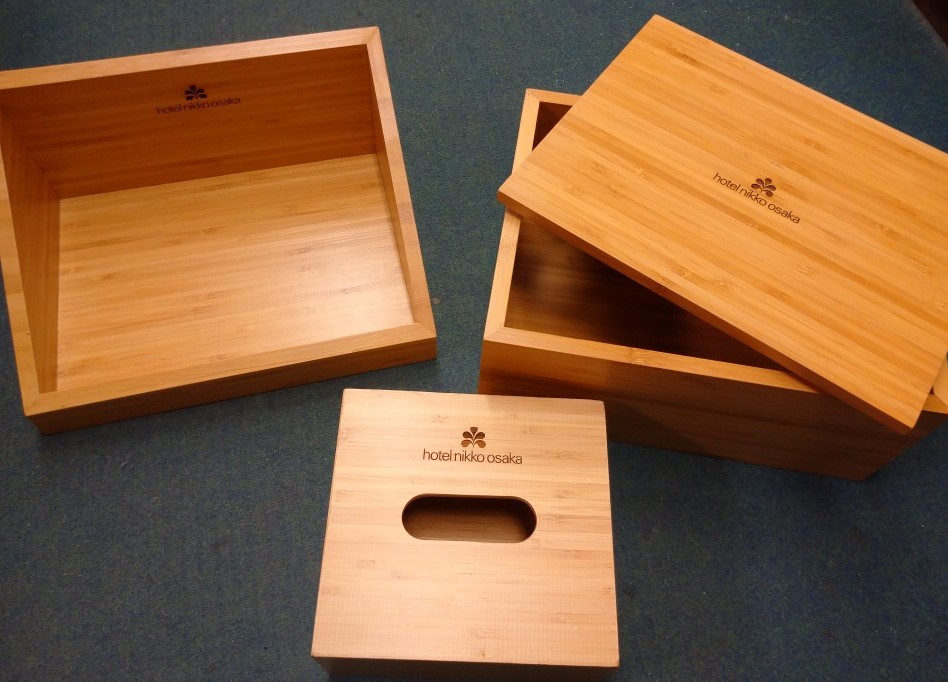 - ホテルで使用される竹のクローク札、アメニティBOX等をオリジナル仕様で別注製作